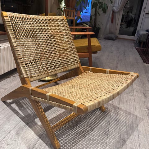 Rørvig loungestol fremstillet i massivt akacietræ med flet i naturfarvet materiale.