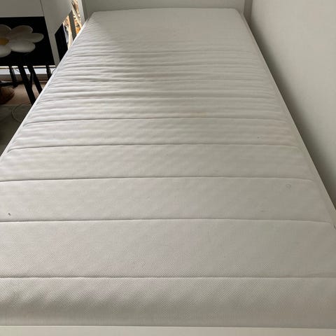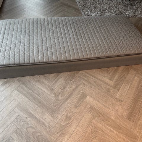 IKEA seng JÄRNUDDA 90x200 med gråt betræk og sorte ben. Sengen har en enkel og funktionel opbygning med stofbetræk og ben i sort materiale. Velegnet til soveværelse eller gæsteværelse.