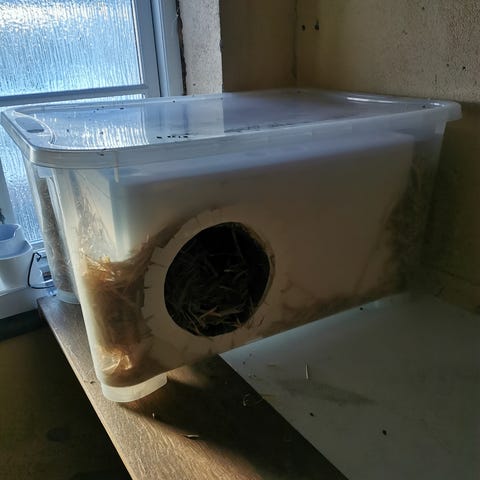 Kattehuse taget kan tages af uden værktøj ved rengøring er fremstillet af rester og genbrug Måler ca L 53/ H 42/ B 33 cm. det et samlet og umalet der er plads til flamingo under huset som kuldebro huset kan også bruges til andre små dyr huset er meget solidt og holder i mange mange år pris hus 300 kr+ tagpap 60 kr+ flamingo 40 kr. kan sendes med GLS foe 110 kr