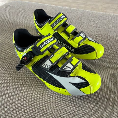 Diadora cykelsko i størrelse 43 med sort farve. Skoene har velcrolukning og med clips under sålen. God stand.