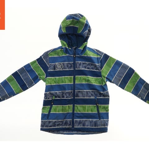 En blå regnjakke til børn med en hætte. Jakken har et mønster af cirkler og en lynlås foran. Ærmerne har elastik omkring håndleddene og reflekterende striber. Jakken har en afslappet pasform, der giver bevægelsesfrihed og beskyttelse mod regn og vind.