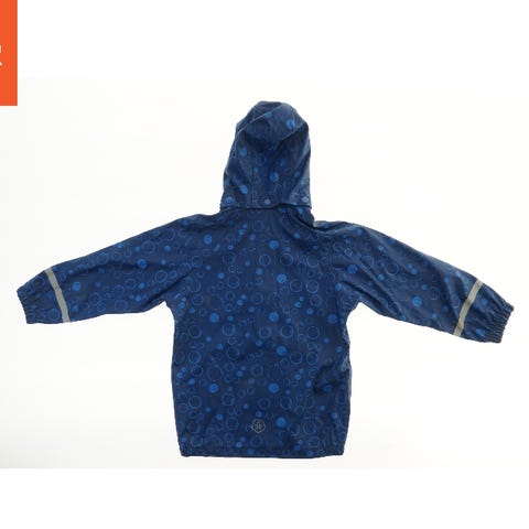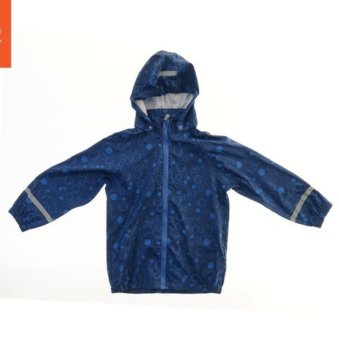 Regnjakke med hætte og lynlås. Jakken har vandrette striber i blå og grønne nuancer med hvidt mønster. Der er to lynlåslommer på forsiden og elastik ved ærmeenderne.