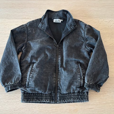 Jakke med hætte og en lukning foran med knapper og lynlås. Den har et grafisk mønster med skateboardere og geometriske former, samt elastik ved håndleddene.