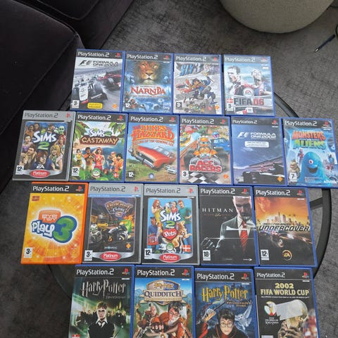 Playstation lot med 12 Playstation 2 spil og 4 Playstation 3 spil + controllere til buzz. Playstation 2 singstar lmikrofoner det er i pæn stand se billederne som er en del af beskrivelsen