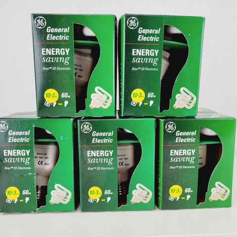 Pære, General Electric, 5 stk Biax S 11W 2pin 900 lumen og 1 stk 9W 600 lumen. Pris pr stk kr 20,-. Samlet kr 100,-.