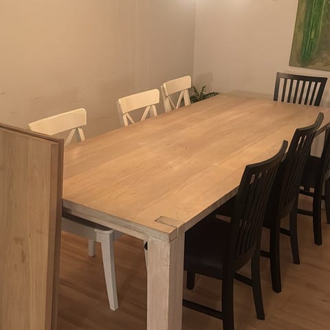 hvidolieret masiv egetræsbord med 2 tillægsplader og 8 stole med ny læder
