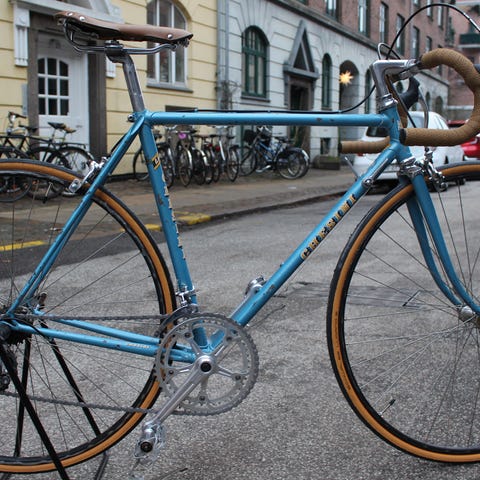 Cyklen er udstyret med Campagnolo-komponenter og fremstår i pæn stand med naturlige brugsspor efter alder.