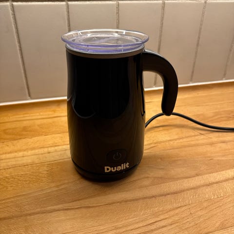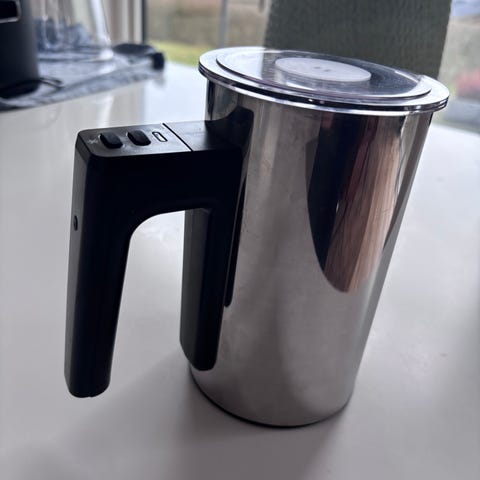 Mælkeskummer i rustfrit stål med sort håndtag og aftagelig ledningsbase. Velegnet til skumning af mælk.