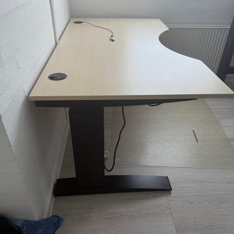 Hæve/sænke skrivebord med plade af bøgelaminat. 160 x 80. Skuffemøbel af bøg, på hjul med 3 skuffer, kontorstol med armlæn. Inventaret er brugt og med forventelige brugsspor.