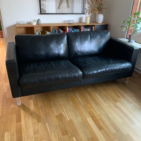 Fin lille sofa i sort læder med stålben.