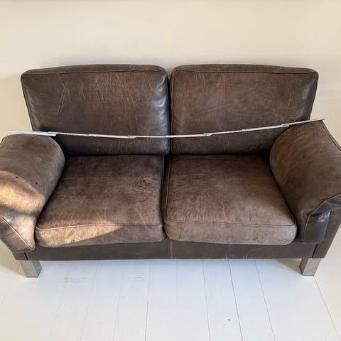 Sofaen har brugsspor, men er stadig fin og funktionel.
