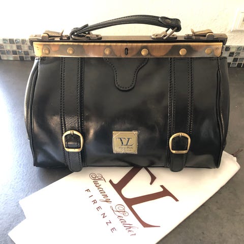Meget lækker læge taske i ægte læder og metalspænder samt skulderrem, denne taske er noget helt særlig og et rigtigt HÅNDVÆRK i læderarbejder, indvendigt m.foer og 2 lommer m.lylåse, en taske der vil blive lagt mærke til! Mål b 35 x 13 x 23, Farve sort.