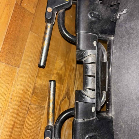 Har forsøgt at tage billeder af de mest synlige brugsspor; Den forreste "klik" bremse er skæv, hvilket besværliggøre funktionen og kan udfordre sammenklapningen, det kan lade sig gøre.