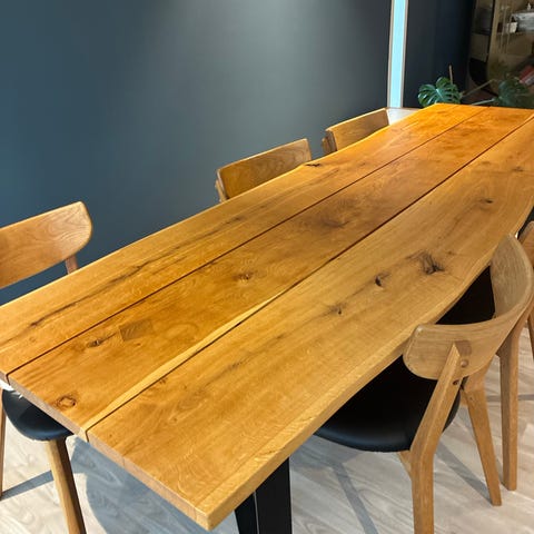 Fremstillet af gammelt bolværkstræ så det er et meget rustikt bord.