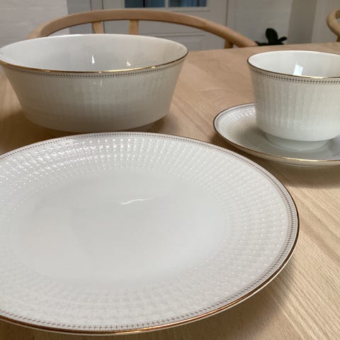 “Pyramide” porcelænskaffestel fra Bucka & Nissen, indeholdende 9 kaffekopper m/underkopper, 12 desserttallerkener, sukker-skål og flødekande, kaffekande, askebægre samt 4 kagefade i forsk form og størrelse, som foto.