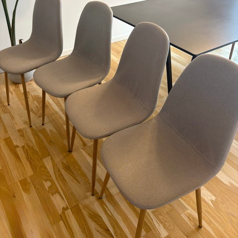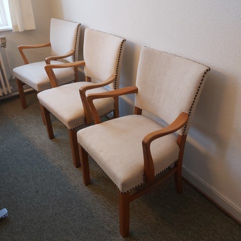 Tre stole med og tre stole uden armlæn. Stabile og fine - men betrækket er falmet og lidt slidt.