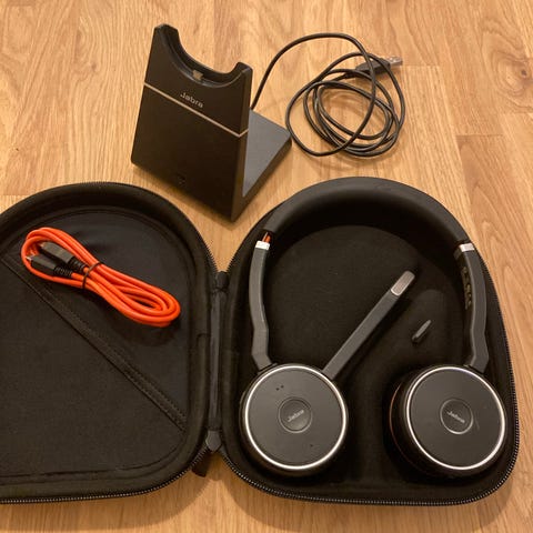 Trådløst headset med god lyd og aktiv støjreduktion, perfekt til både opkald og musik. Inkluderer ladestander.