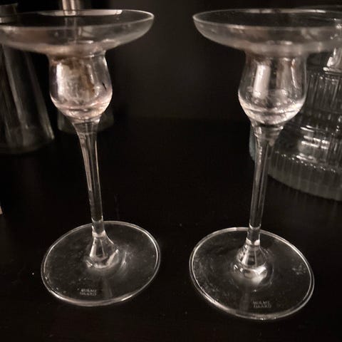 2 lysestager med mundblæst glaspærer fra Holmegaard. Lysestagerne er i messing som er fremstillet på det gl. danske G. V. Harnisch værksted. Nem påfyldning af lampeolie.