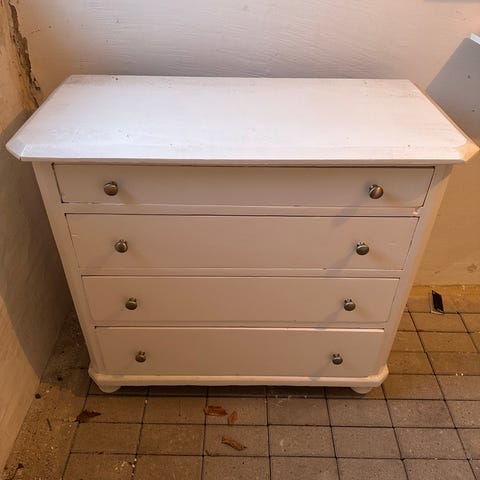 Kommode i hvid med fire skuffer. Kommoden har klassisk design med dekorative greb og en robust opbygning. Velegnet til opbevaring af tøj eller andre genstande i entré, soveværelse eller stue. Matchende spejl og taburetter kan tilkøbes (se særskilte annoncer)
