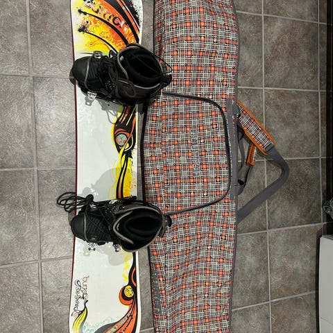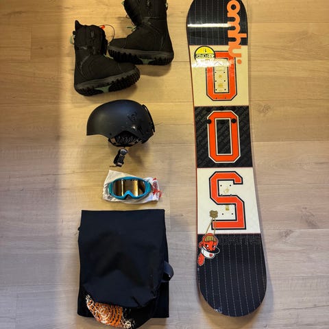 Snowboard fuldt sæt, inklusiv snowboard, støvler, rygbeskytter og snowboard taske.