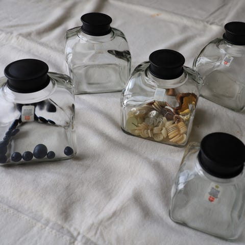 Holmegaard krydderiglas sæt bestående af to klare glas med sorte låg. De er 7 cm. høje (målt med låg).