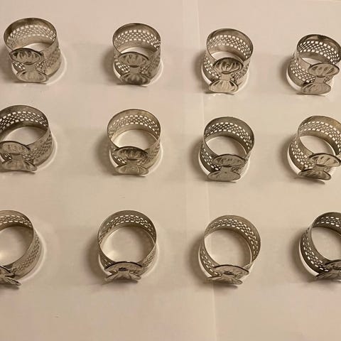 Fineste Servietringe i sølvplet med hulmønster. Har 20 stk. Sælges i SÆT af min 4 stk.