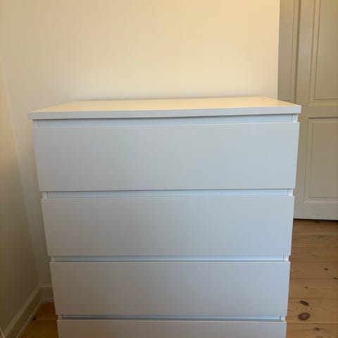 IKEA Malm Kommode i hvid. Kommoden har flere skuffer og et enkelt, funktionelt design. Den er egnet til opbevaring i forskellige rum som soveværelse eller stue. Der tilhører også glasplade