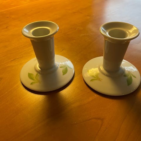 Sælger et sæt originale lysestager fra Lyngby i klassisk hvid porcelæn.
