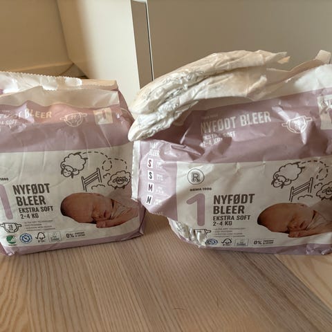 7 uåbnede pakker bleer, Str. 1 fra Rema1000 'Nyfødt'.
