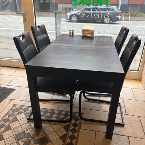 Ca. 8 år gammelt spisebord med hård sort blank bordplade.