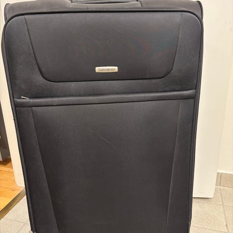 Samsonite håndbagage kuffert i stofmateriale. Kufferten har teleskophåndtag og flere opbevaringsrum, hvilket gør den egnet til rejser og transport af personlige ejendele.