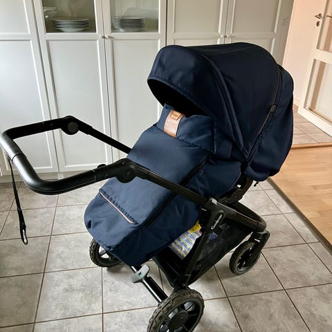 Emmaljunga klapvogn i sort farve. Klapvognen har et robust stel og justerbart håndtag. Den er designet til børns komfort og sikkerhed med polstrede sæde- og ryglænskomponenter samt en sikkerhedssele. Velegnet til daglig brug og udendørs aktiviteter.