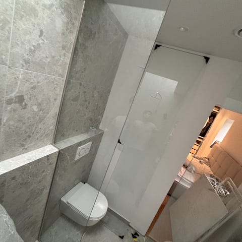 6 brusevægge i glas med sort ramme, designet til brug i badeværelser. Væggene fungerer som en afskærmning til bruseområdet og er egnet til installation i hjørner eller mod væg. Materialet er glas med sort metalramme, hvilket giver et moderne og minimalistisk udseende.