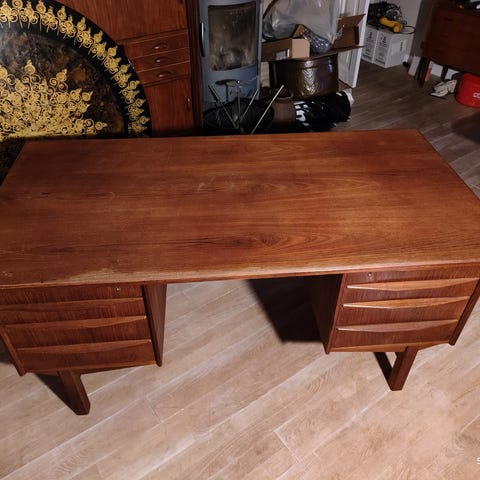 Super fint skrivebord i teak, med skuffer i front og hylder i bag. Der er nøgle med til skrivebordet, men hylder i bag mangler hyldebærer.