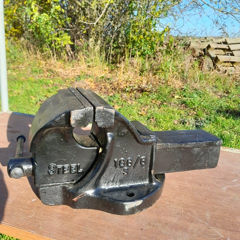 Ældre, solid bænk -/skruestik med en vægt på 5,3 kg, til finere arbejde med træ og metal.