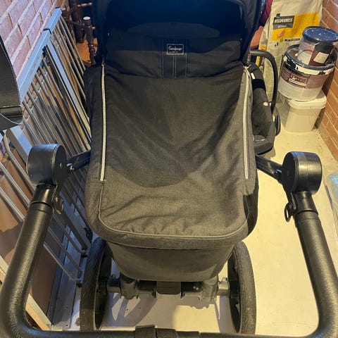 Der følger en klapvogn med, som kan sættes ovenpå barnevognen og ligges helt fladt ned.