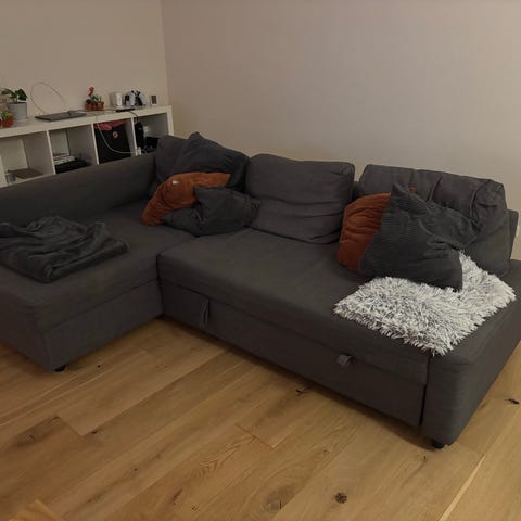 IKEA Friheten sovesofa i grå farve. Sofaen har en chaiselong med opbevaringsplads under sædet. Sofaen kan omdannes til en soveplads, og passer godt til en stue eller et gæsteværelse.