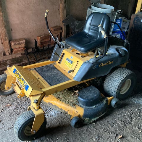 Mowox PLT 42 riderplæneklipper med 42 tommer klippebredde. Maskinen har sort sæde og gul/sort farvetema. Designet til effektiv græsklipning med komfortabel siddeplads og brugervenlige betjeningsgreb.