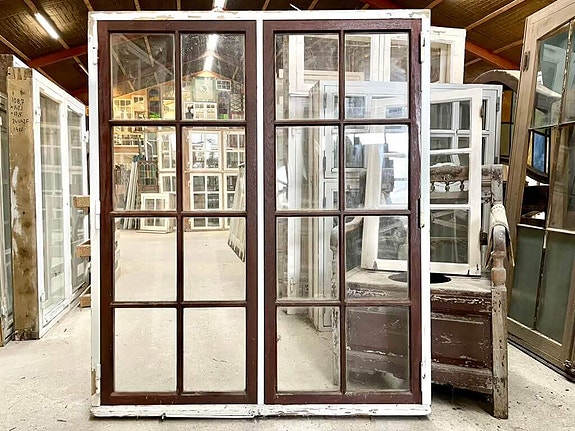 Originalt forsatsvindue med komplet ramme, hængsler og tvinger. Fremstår i fin stand med let afskallende maling. Målene på de forskellige enheder i partiet varierer en smule fra det angivne.