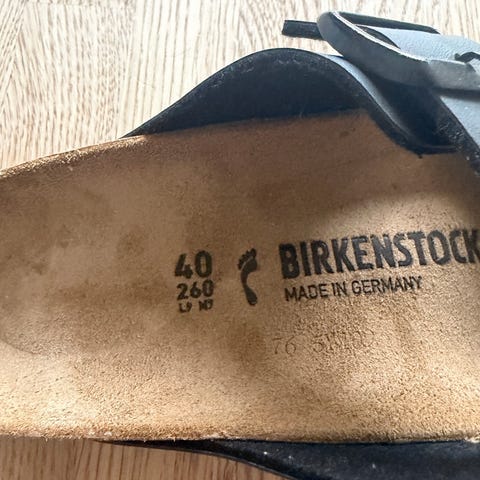 Birkenstock sandaler i størrelse 39 med blå remme. Sandalerne har to justerbare spænder og en fodformet korksål. Modellen er designet til at give støtte og komfort ved brug.
