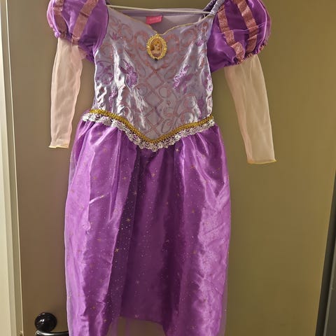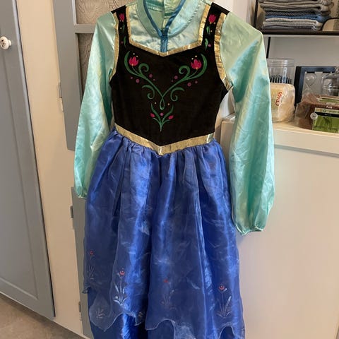Disney Frost kjole til pige 4-5 år med blå og sort farver. Kjolen har puffede ærmer og dekorative mønstre på brystet. Materialet er blankt og glat, velegnet til kostumebrug.