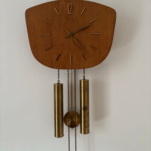 Gl. antik egetræs Jungehans vægur. (1800-1920erne) med messing løvehoved.