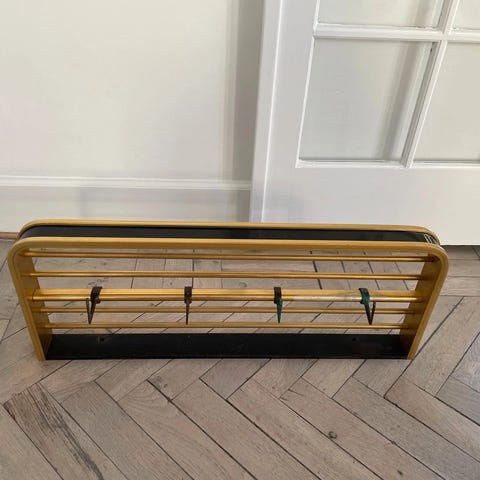 Gammel hattehylde i hvid plast samt med messing ramme.