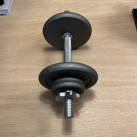 Jernvægte sæt bestående af flere vægtskiver i forskellige størrelser, en vægtstang og fire låse. Vægtskiverne er lavet af jern og har forskellige vægtangivelser. Sættet kan bruges til styrketræning og vægtløftning.