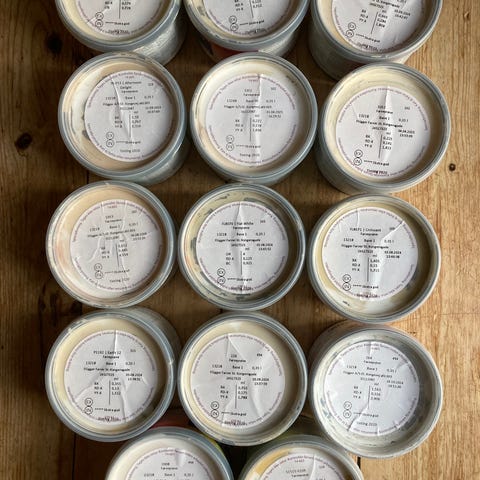 Flügger 1388 (rowan berry/rønnebær, med andre ord orange-rød). Helt ny, åbnet og brugt en smule 19. januar 2026. Der er måske 2 liter tilbage.
