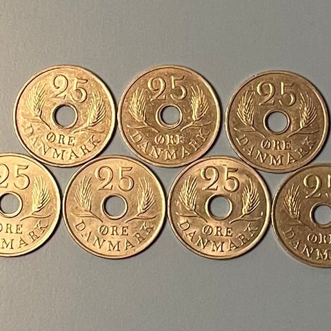 Samlermønter 25 øre årgange 1973 til 1988. 16 stk. Mønterne er cirkulations mønter og er brugte med brugsspor men i god stand uden væsentlige skader. Kan sendes. Sender ikke med fix og færdig.