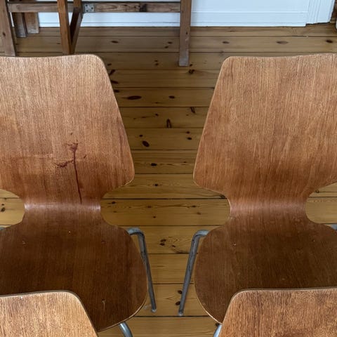 Har fået 6 træstole som jeg har sat i stand..