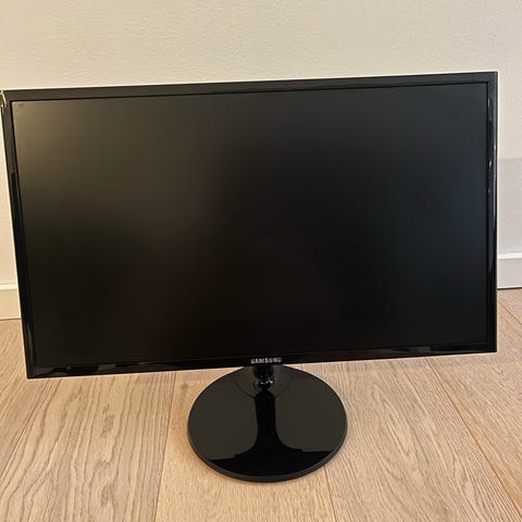 Samsung 24" skærm med rund sort fod. Skærmen har en skærmstørrelse på 24 tommer og er egnet til almindelig computerbrug.
