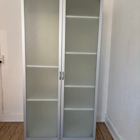 Et stort, rummeligt klædeskab med skuffer og stang til bøjler. Bag-pladen har nogle skavanker og der mangler et par skruer, men skabet er stadig nydeligt og funktionelt.