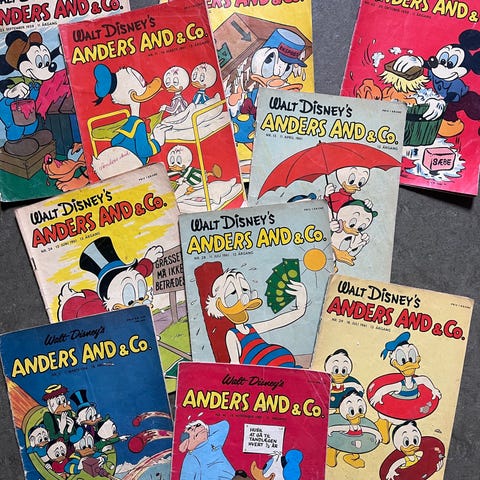 Walt Disney Anders And & Co. tegneserie blade med forskellige historier og illustrationer. Serien indeholder flere numre med klassiske Disney-figurer som Anders And, Rip, Rap og Rup, samt andre karakterer. Bladene er i forskellige udgaver og farver, velegnede til samlere og læsere af Disney-tegneserier.